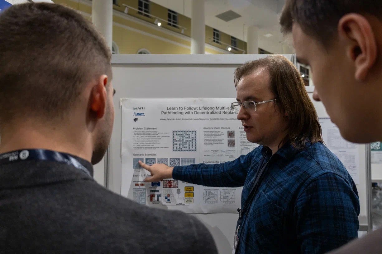 На конференции можно было легко встретить Алексея Староверова, Виталия Воробьёва, Антона Андрейчука, которые в мельчайших подробностях расписали бы вам методики «Neural Potential Field для избегания столкновений при планировании локальных движений» (ссылка), «Объектно-центричного обучения с модулем слотовой смеси» (ссылка), а также алгоритм «Учимся следовать: децентрализованная непрерывная многоагентная навигация посредством планирования и обучения» (ссылка), чья презентация запечатлена на фото ниже: