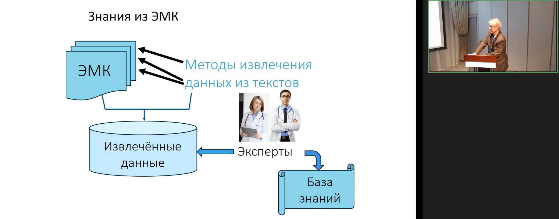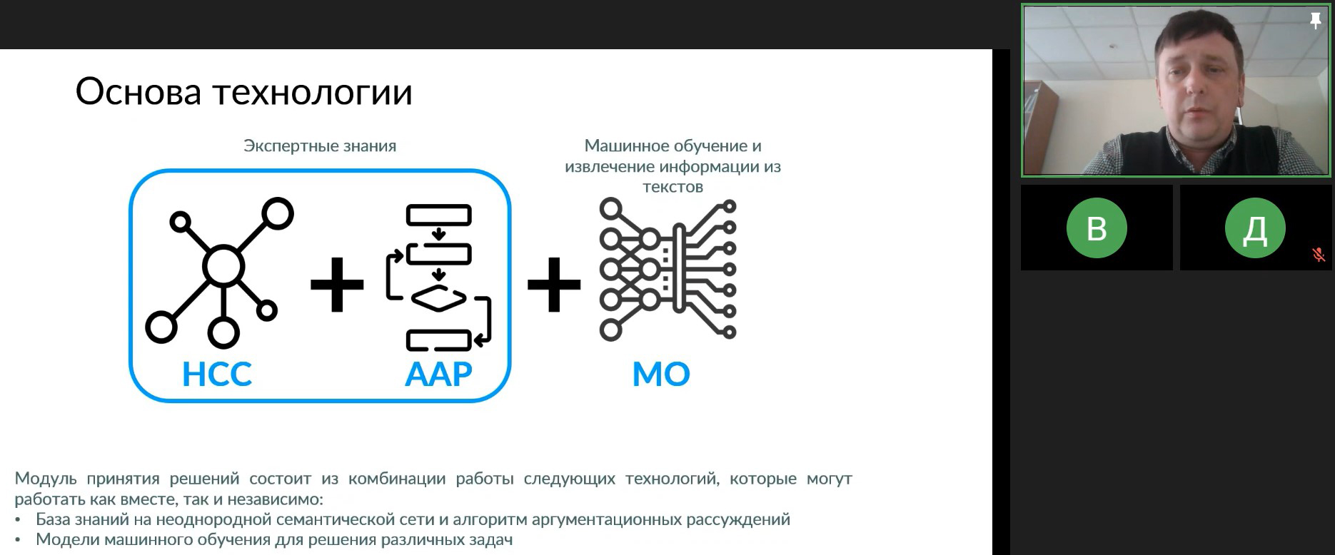 БЗ собирают с помощью экспертов, менеджер здоровья оценивает риски заболеваний. А знания о заболеваниях, факторах риска, причинах, возможных осложнениях и профилактике извлекают из полных текстов статей, исследований, отчётов, экспертных мнений и, сверх того, из массивов с разнородными данными. Система объединяет и интегрирует различные технологии ИИ, что позволяет отслеживать выполнение рекомендаций и оценивать состояние здоровья в динамике. Собственно, обзору технологий и были посвящены остальные доклады.