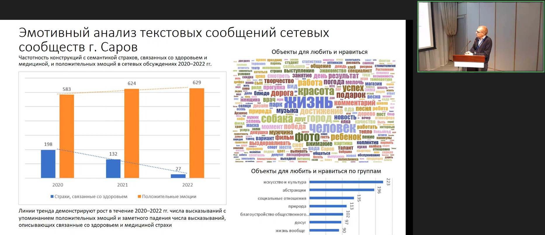 В качестве примеров Иван привёл результаты исследования пабликов Сарова, в частности, динамику социального напряжения, панических настроений, упоминания властей и просто неоднозначную реакций сообществ на эпидемию COVID-19 и самоизоляцию.