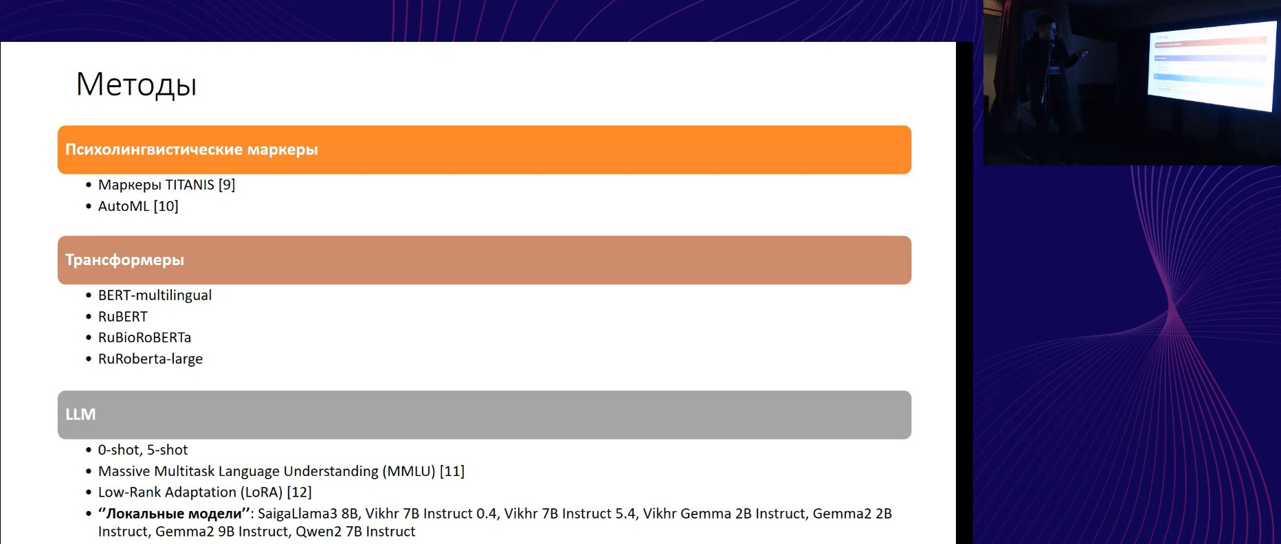 Например, Иван Смирнов рассказал о своём многопрофильном коллективе и выявлении психологического неблагополучия путём обработки естественного языка. «Технологии психолингвистического анализа текстов для здоровьесбережения» (ссылка) помогают выявлять и оценивать расстройства, депрессивность, тревожность, отношение к ЗОЖ сотрудников предприятий или даже жителей моногородов исходя из их текстов в социальных сетях, корпоративной переписки, массового анкетирования. Одновременно можно измерять смену настроений целых сетевых сообществ, их психоэмоциональную реакцию на те или иные события, страхи и предрассудки.