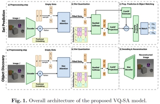 Неудивительного, что на форум были отряжены лучшие силы 71 отдела ИПИИ. Для секции «Компьютерное зрение» Даниил Кириленко, Александр Корчемный, Алексей Ковалёв, Александр Панов и Константин Смирнов (Университет Иннополис) подготовили презентацию «Квантовые распутанные представления для объектно-центрированных задач» (ссылка), в которой представили модель VQ-SA (Vector Quantized Slot Attention) для двухэтапной обработки сигналов соответствующих слотов с помощью векторной символьной архитектуры. Эксперименты проводили на датасете CLEVR, а для замерений были разработаны уникальные методики DQCF-микро и DQCF-макро (Disentanglement Quality of Categorical Generative Factors).